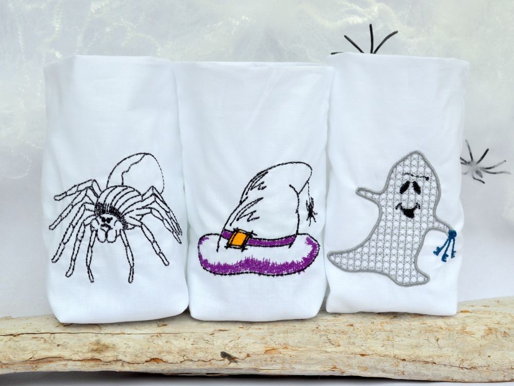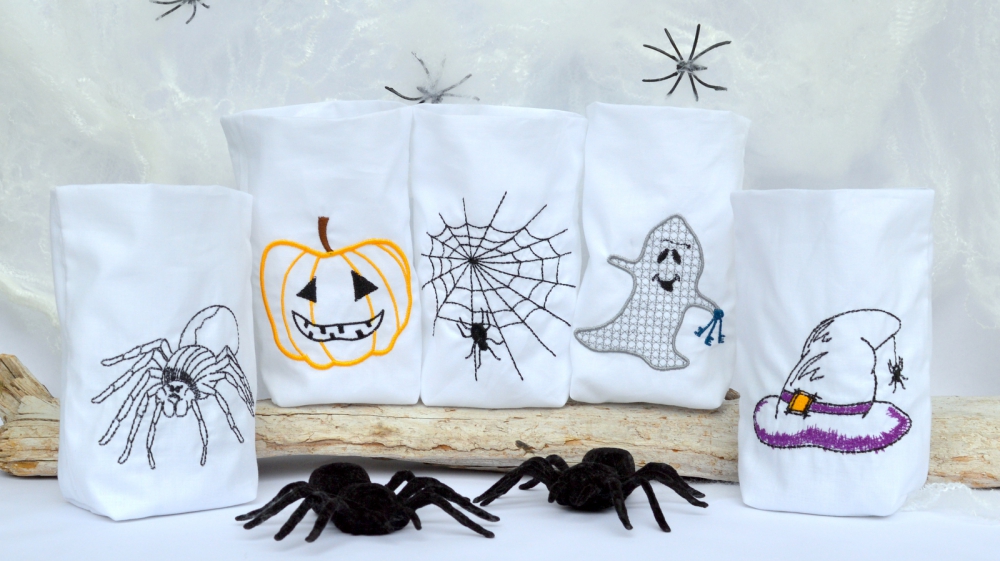 kleine Stoffbeutel mit süß schaurigen Motiven zu Halloween, in die ein LED Teelicht eingestellt werden kann. Schaurige Deko für die Halloweenparty.