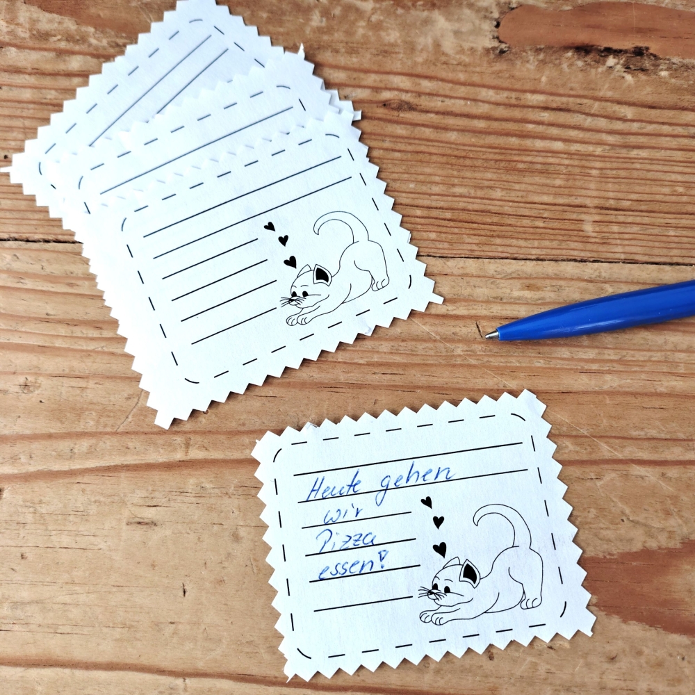 Im ZIP befindet sich zusätzlich eine PDF Vorlage zum Ausdrucken in DINA4 Größe, auf der 8 Kärtchen aufgerduckt sind. Daraus lassen sich süße Kärtchen zum Aufrollen mit Wünschen und Botschaften für den Kalender fertigen. Einfach beschriften, aufrollen und in die Fächer stecken.