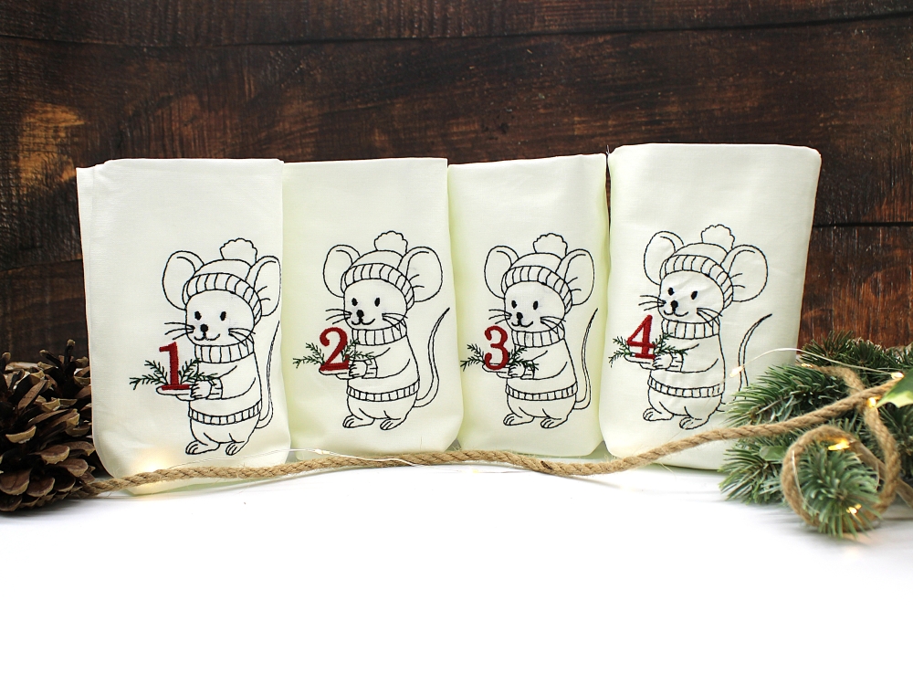 Stickdatei für kleine Stoffbeutel mit Adventszahlen und kleinem Wintermäuschen, in die ein LED Teelicht eingestellt werden kann. Süße Deko für die Fensterbank, den Adventstisch und ein liebevolles Mitbrings`l in der Weihnachtszeit.