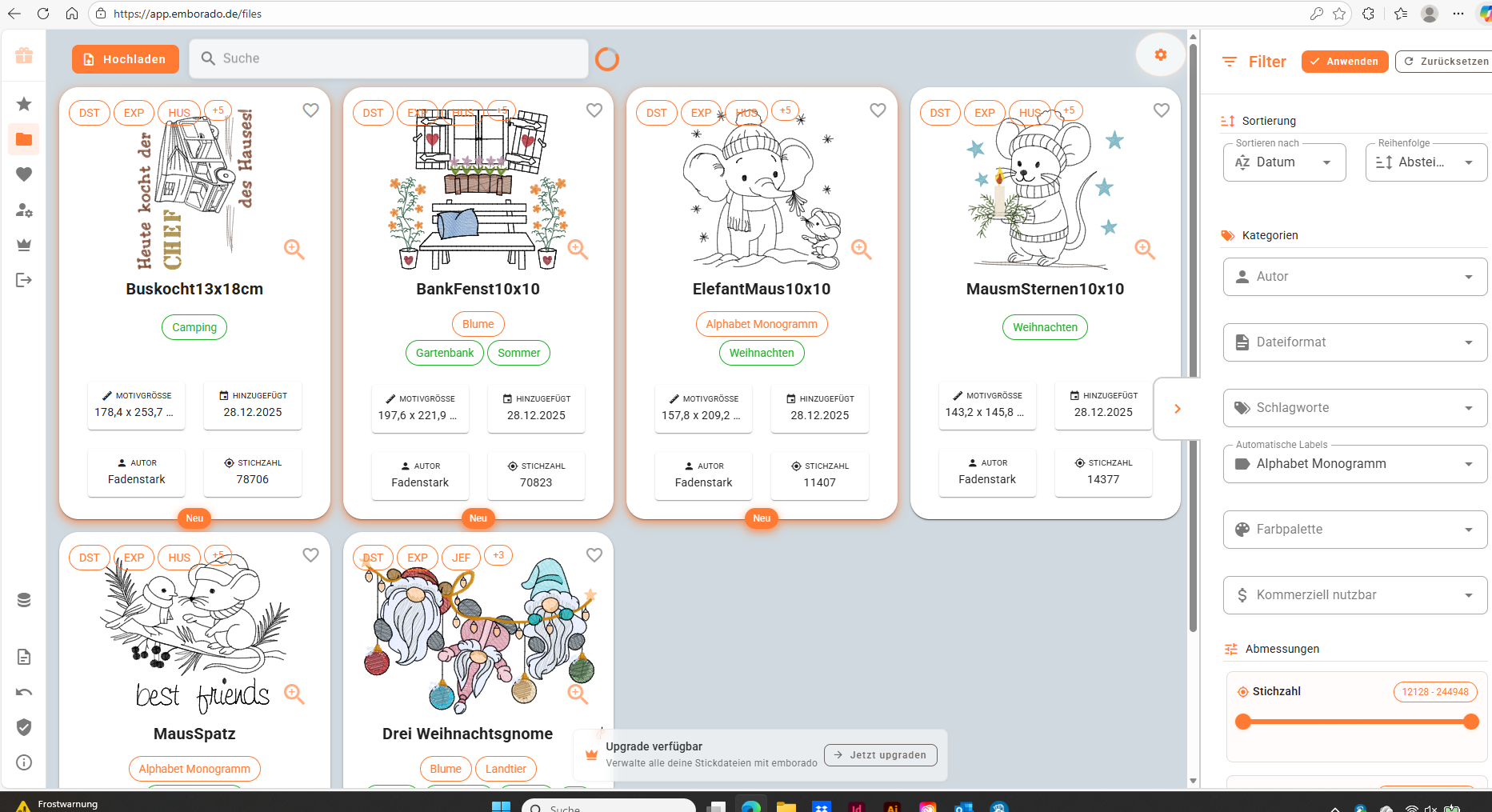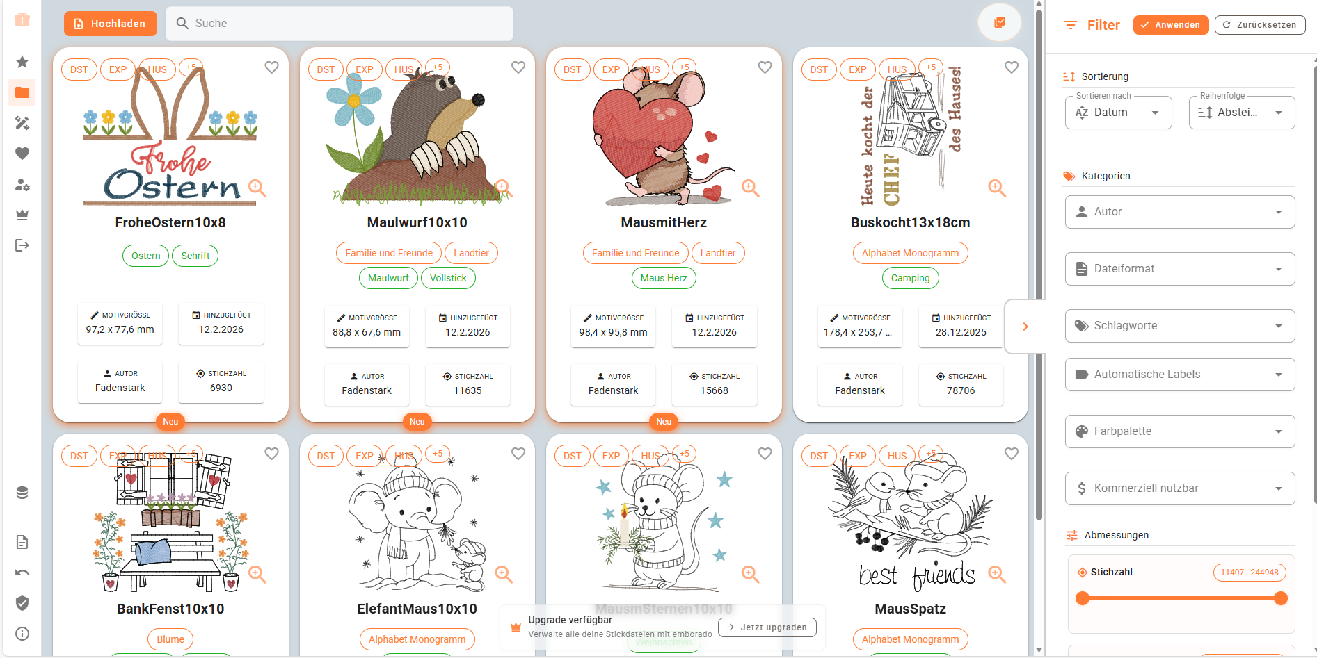Eine Plattform, die dir ermöglicht, deine Stickdateien zu sortieren und schnell das gesuchte Design zu finden, da die Designs mit Bilder angezeigt werden! Eine effiziente Art, seine Stickdateien zu verwalten! Du kannst Emborado derzeit mit 100 deiner Stickdateien kostenlos testen: