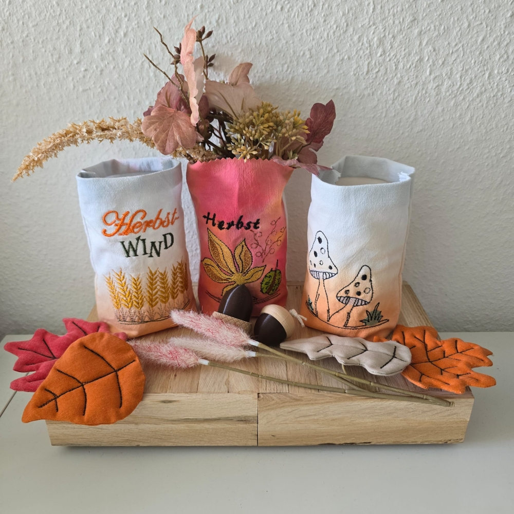 Stoffbeutel mit herbstlichen Motiven, in die ein LED Teelicht eingestellt werden kann. Süße Deko für die Fensterbank, Terrasse, Balkon und Garten oder auf dem Kaffeetisch.