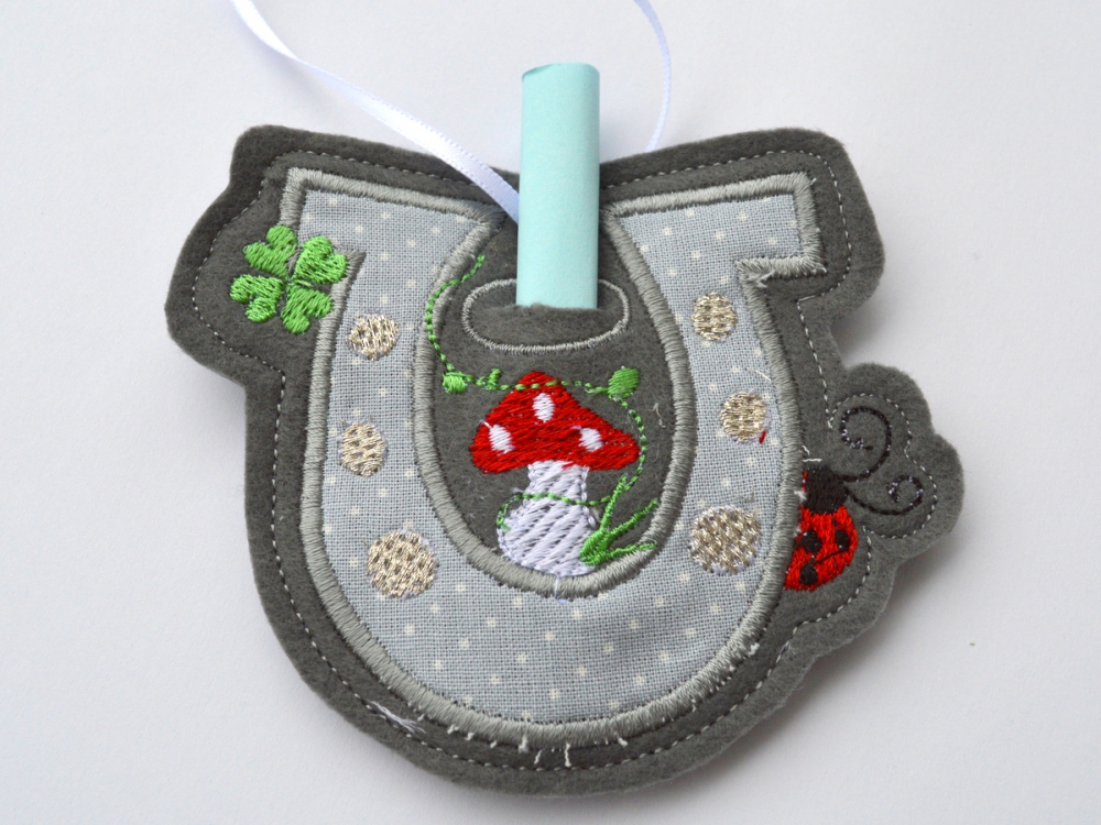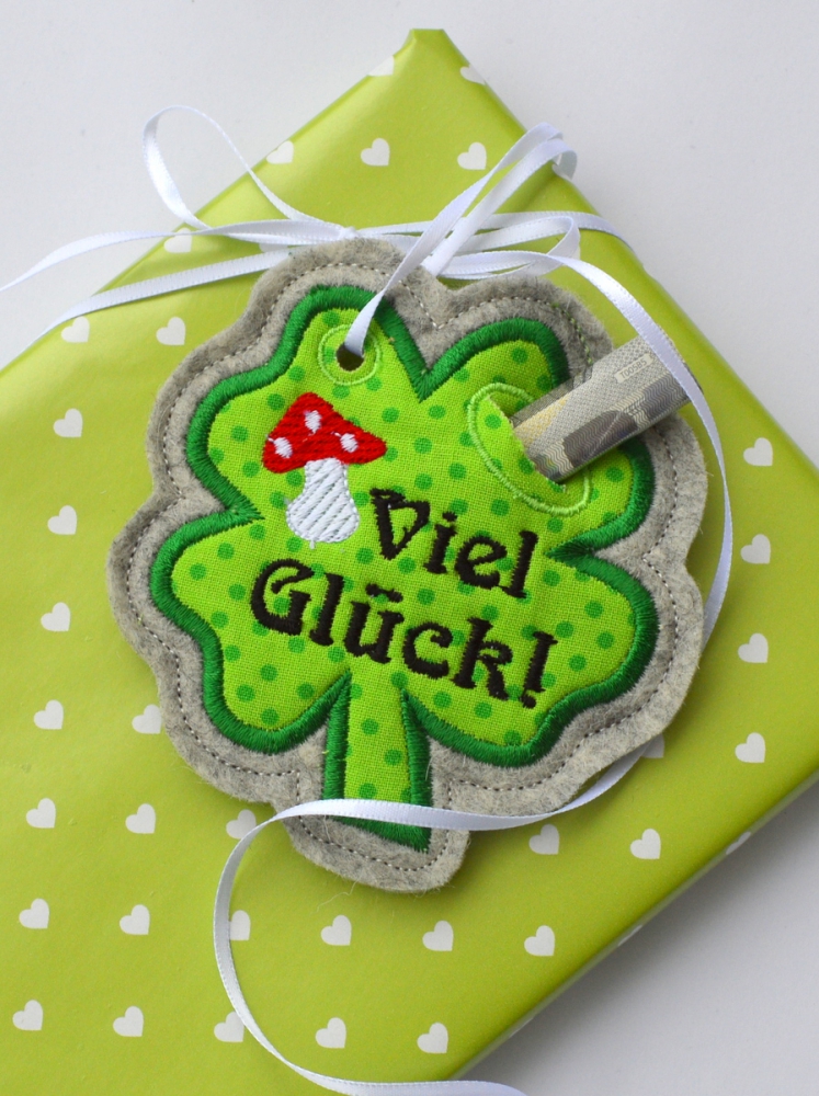 Glück kann man nicht nur an Silvester gebrauchen, Stickdatei für wirkungsvolle Geschenkanhänger "Glücksbringer". Sie werden komplett im Rahmen von der Stickmaschine gestickt!