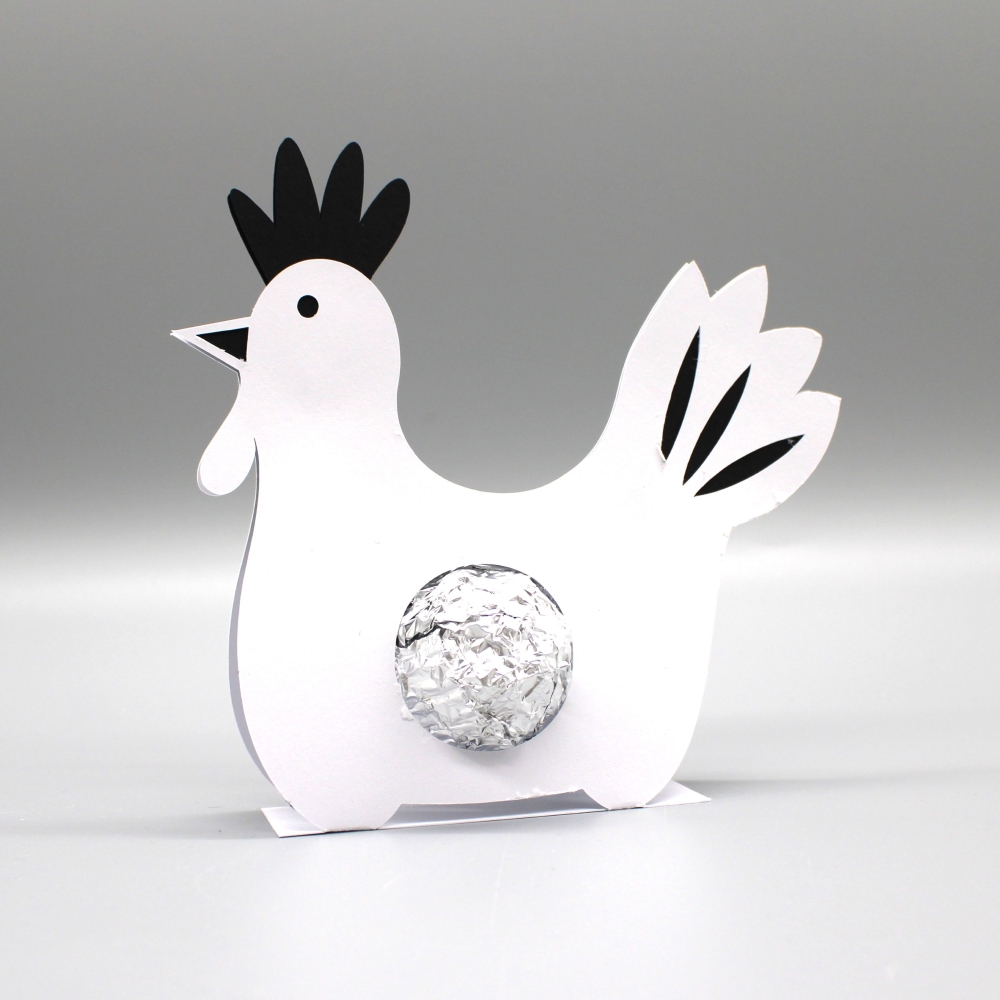 Plotterdatei für ein Huhn aus Papier zum Befüllen mit runden Schokopralinen, Ei oder Schokoei.