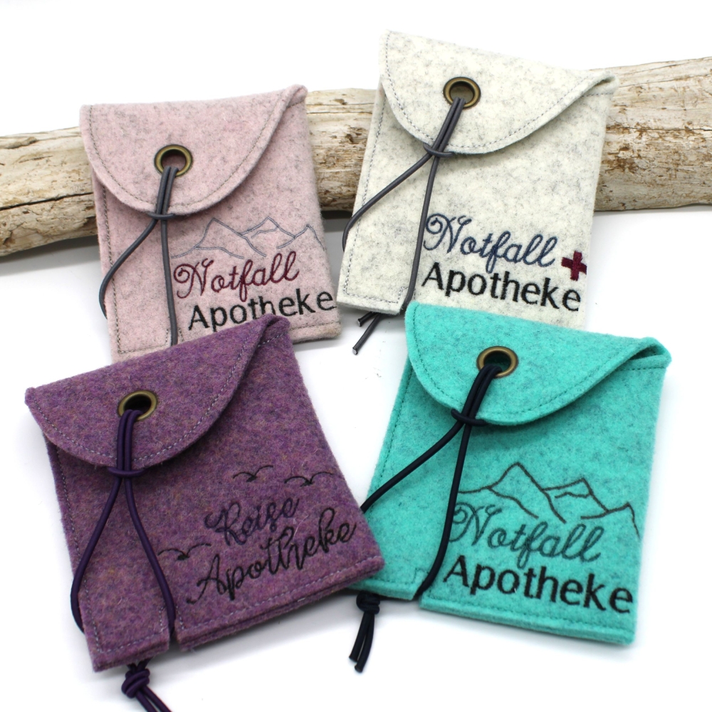 Enthalten sind 5erlei Motive für allerlei Situationen: Notfallapotheke am Berg oder mit Kreuz gestickt, Spielplatzapotheke für kleine Schürfwunden, Reiseapotheke.
