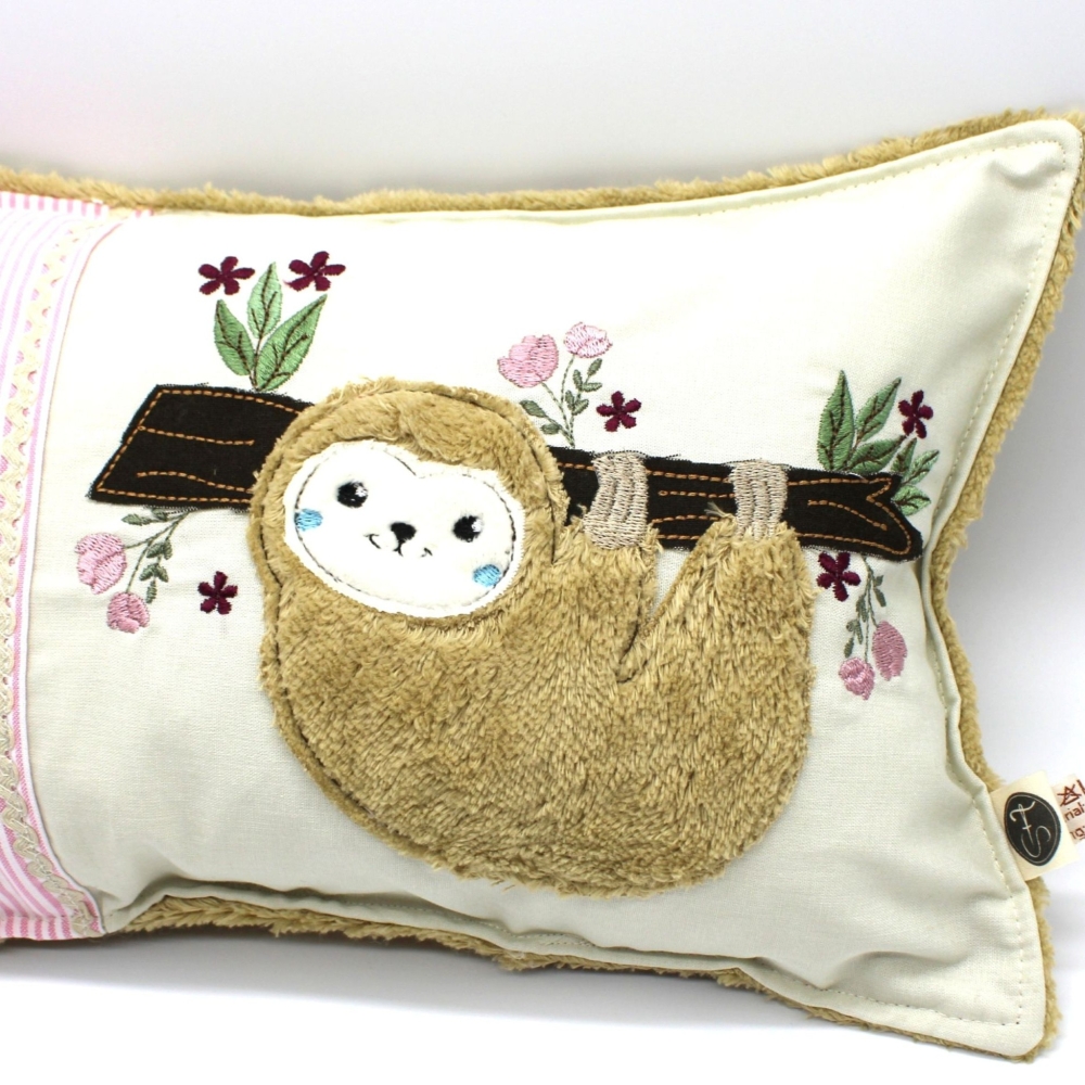 Das süße Faultier wird während dem Sticken mit Stoff unterlegt und verziert Kissen, Taschen und vieles mehr. Es hängt entspannt an seinem Ast und wartet darauf, aus deiner Stickmaschine zu hüpfen!