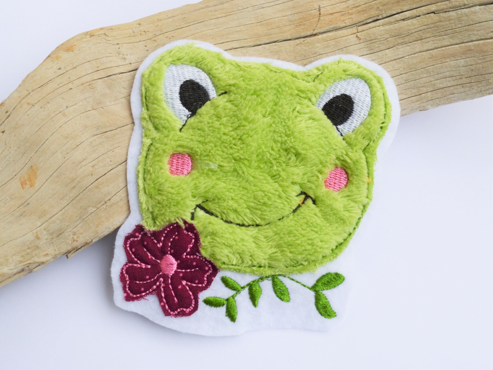Stickdatei Frosch mit Blume als doodle Applikation,