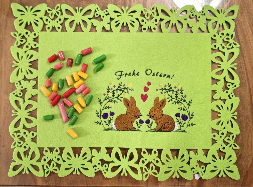 - Stickdatei zwei Hasen unter mit Blumen mit "Frohe Ostern!", 11x18cm, Stiche 22800