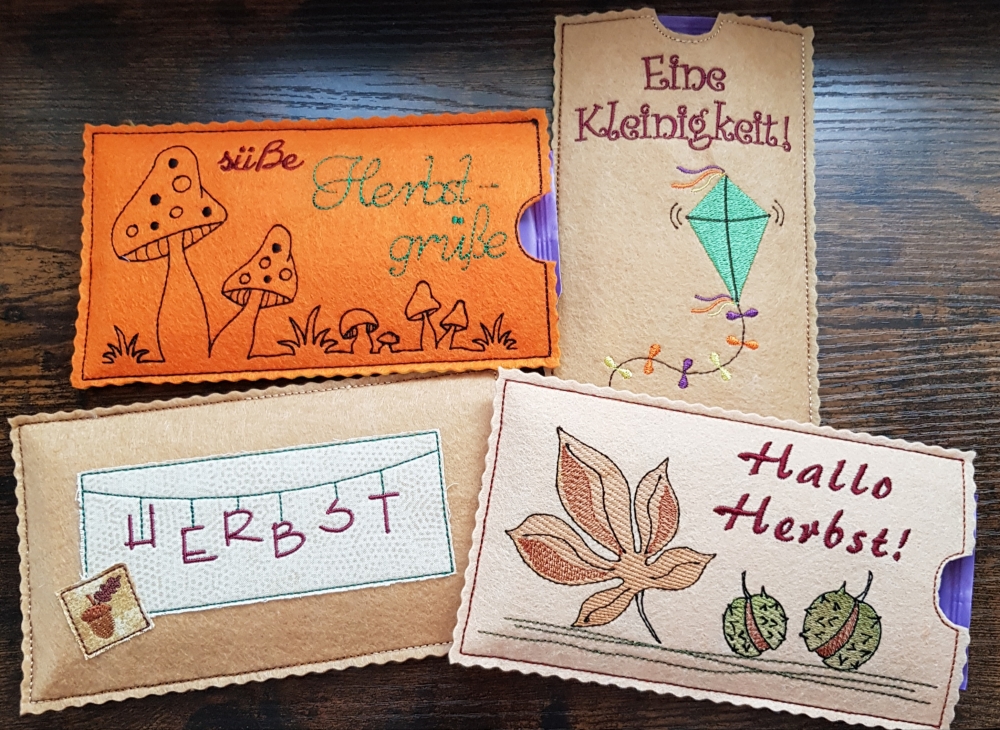 Zum Herbst Schokolade schön verpackt verschenken. Die Hüllen werden komplett im Stickrahmen gestickt und nach dem Sticken außen herum ausgeschnitten.