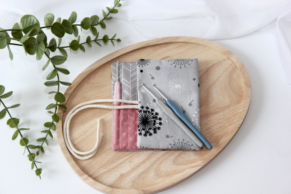 Die schnell gestickten Rollenetuis aus Baumwollstoffen sind praktische Begleiter für Häkelbegeisterte unterwegs. Sie bieten je nach gewählter Variante Platz für die verschiedenen Häkelnadeln.