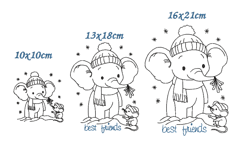 Süße Stickdatei mit der kleinen Maus und ihrem besten Freund, dem Elefanten.  Die zwei genießen einen wunderschönen Wintertag!