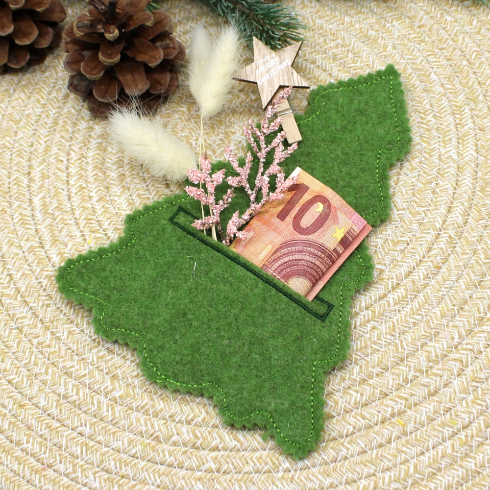 Das Bäumchen wird komplett im Rahmen gestickt, anschließend ausgeschnitten. Die zwei eingestickten "Fächer" werden eingeschnitten, durch diese können z.B. Geldscheine, Kerzen, Besteck oder Grüße gesteckt werden.