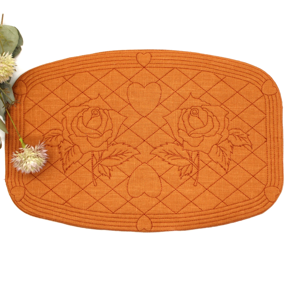Jeder Untersetzer zeigt ein harmonisches Quilt-Muster mit Rosen und Herzen.