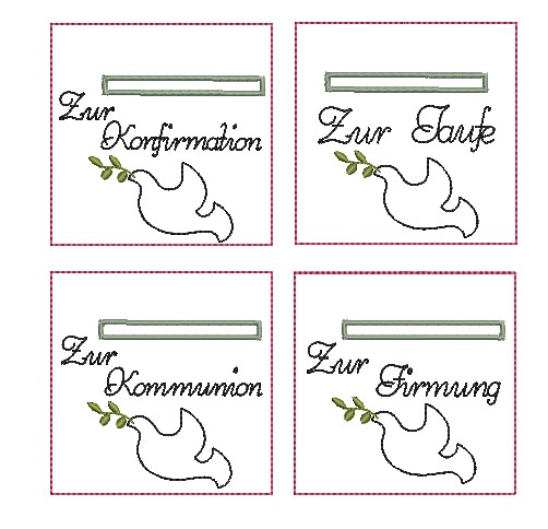 Enthalten sind vier Varianten mit verschiedenen Schriftzügen in der Größe 9,5cm x 9,5cm.
